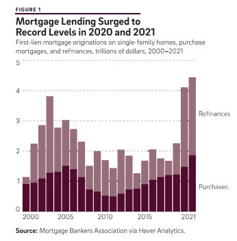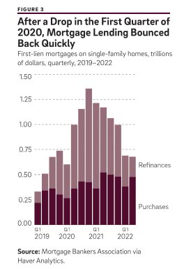 Looking to the future, mortgage interest rates have risen very significantly in 2022, and mortgage lending has fallen sharply as a result. Higher interest rates, assuming they persist, will be a headwind for the the housing market and presage a challenging period for the mortgage industry, which has grown in size and enjoyed record profits during the pandemic. Careful ongoing monitoring of the mortgage finance system seems warranted during this period of transition.
