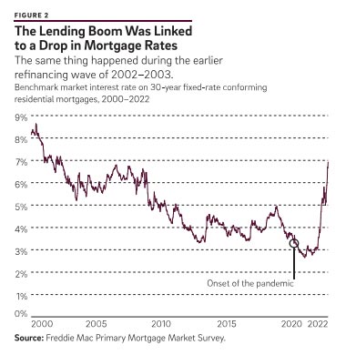 This surge in lending was closely connected to lower mortgage interest rates. The Freddie Mac benchmark 30-year fixed mortgage rate fell below 3 percent for the first time in July 2020 and remained at or close to its all-time low through the rest of 2020 and 2021 (Figure 2).?
