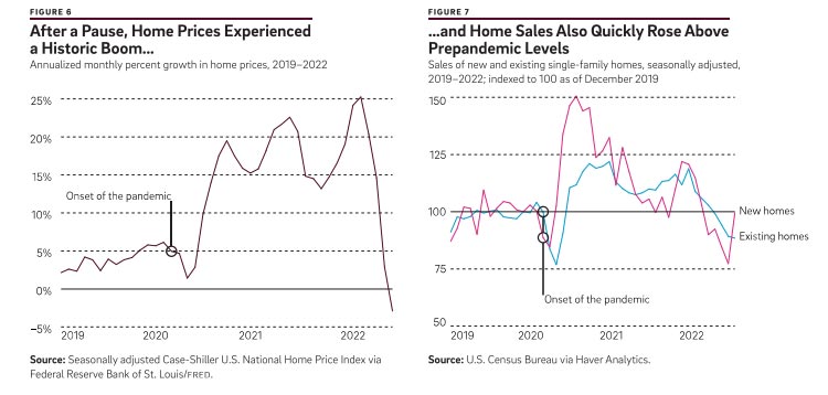Regarding this third channel, home sales also quickly bounced back after dropping sharply at the start of the pandemic, with home sales exceeding pre-pandemic levels by mid-2020 (Figure 7). Sales of both new and existing homes rose, with new home sales buoyed by a boom in housing construction. This combination of robust home sales and higher home prices explains why the volume of purchase mortgages surged above pre-pandemic levels (as shown earlier in Figure 3).